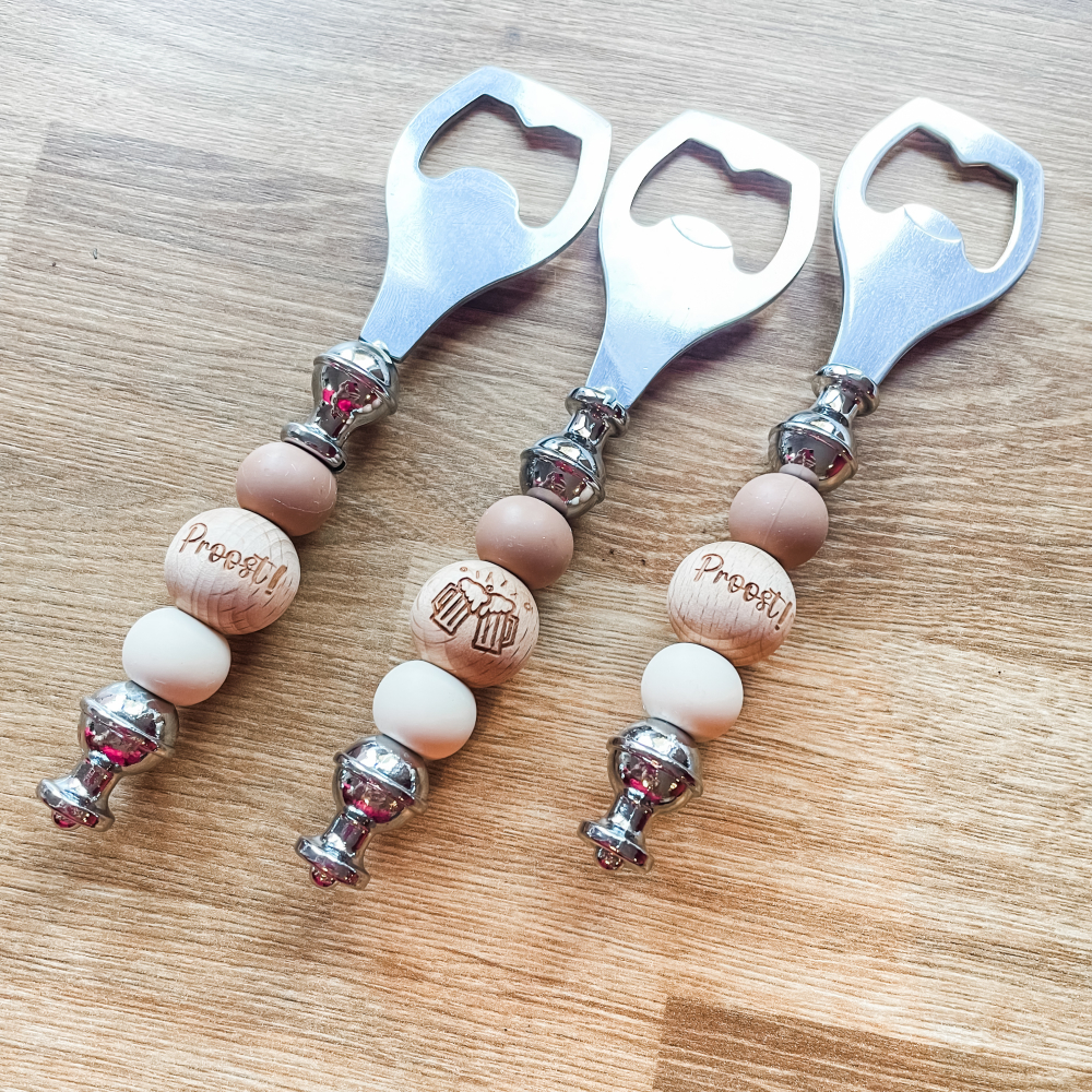 Deze mooie bieropener is een super leuke cadeautje voor elke bier liefhebber. Op de houten kraal staat aan de ene kant de tekst proost en op de andere kant staan 2 bierpullen afgebeeld.
