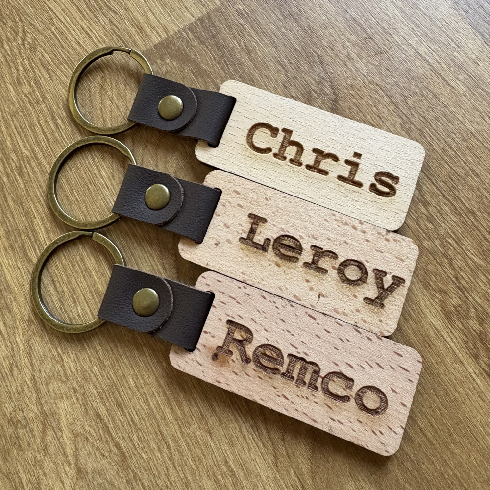 Een mooie houten sleutelhanger waar je een naam op tekst in kan graveren.