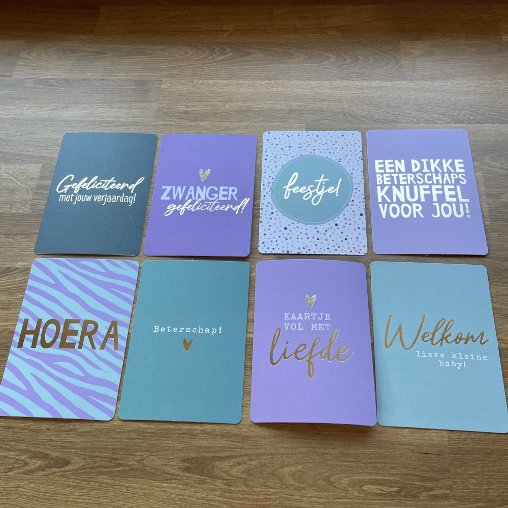 Een super leuk setje van 8 mooie kaarten. Deze kaarten zijn van een mooie stevige papier soort met goudfolie.
