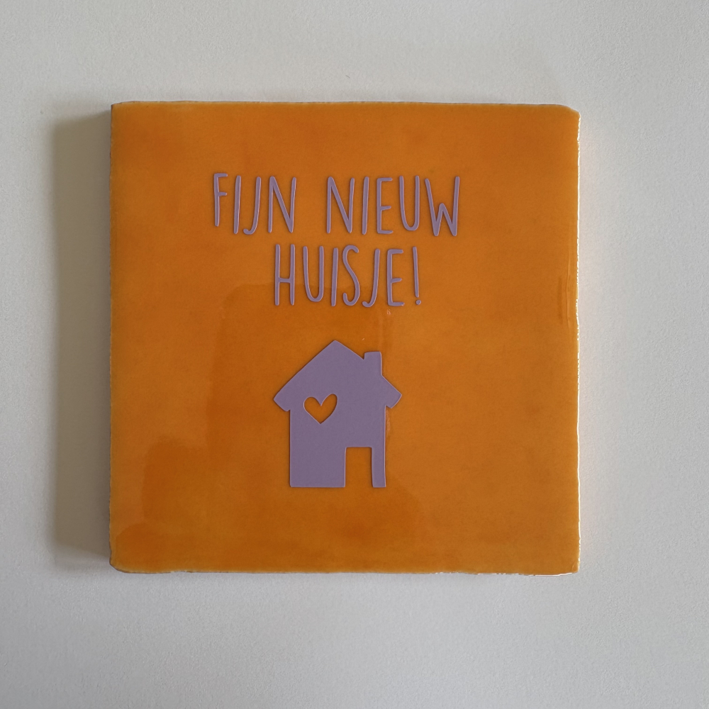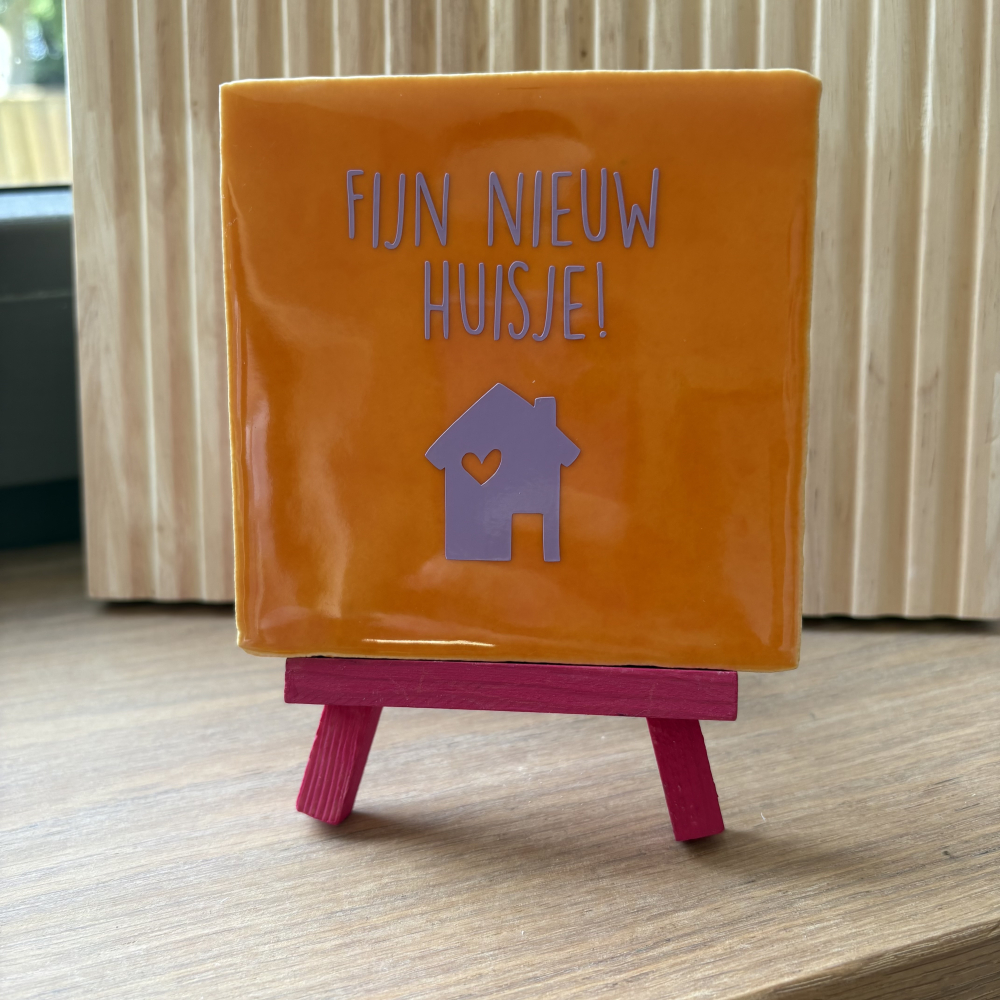 Een mooie oranje tegel met roze opdruk fijn nieuw huisje, het perfecte kado voor iemand met een nieuw huis. De tegel is 10x10 cm en past perfect in onze tegel standaards, ideaal zo kun je door het hele huis de tegel een mooi plekje geven.